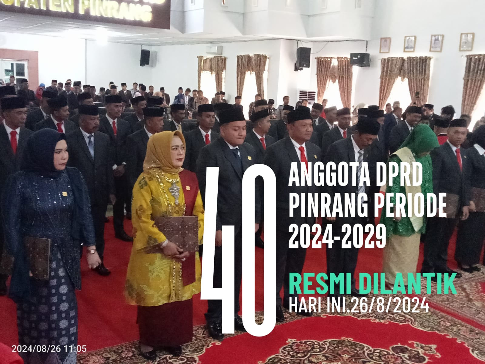 PINRANG|Matalasinrang.com- Sebanyak 40 anggota Dewan Perwakilan Rakyat Daerah (DPRD) Kabupaten Pinrang,resmi dilantik,Senin,26 Agustus 2024 bertempat di ruang Rapat Paripurna