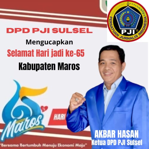 Dalam rangka Hari Jadi Kabupaten Maros ke-65, Ketua DPD Persatuan Jurnalis Indonesia (PJI) Sulawesi Selatan, Akbar Hasan, menyampaikan ucapan selamat dan apresiasinya atas kemajuan dan perkembangan Kabupaten Maros selama 65 tahun terakhir. Akbar mengapresiasi kerja keras Bupati Maros H.Chaidir Syam dan seluruh elemen masyarakat Maros yang telah berkontribusi dalam membangun daerahnya. Ia juga menekankan pentingnya persatuan dan kebersamaan dalam menghadapi tantangan pembangunan di masa mendatang.