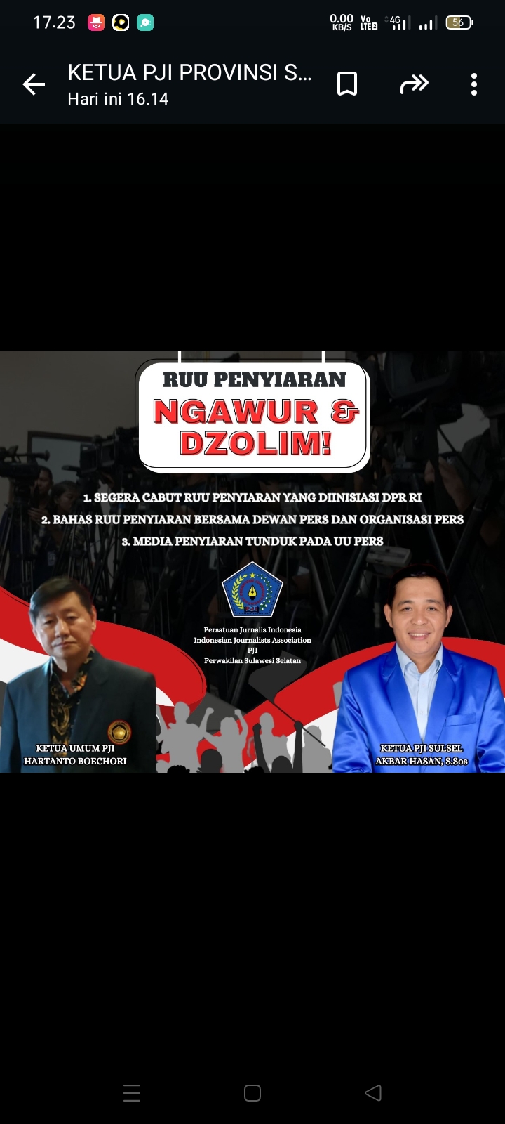 Menurut, Hartanto Boechori, Ketua Umum PJI (Persatuan Jurnalis Indonesia), menegaskan,bahwa Akbar Hasan yang dikenal juga sebagai Akbar Polo, adalah Ketua PJI Perwakilan Sulawesi Selatan yang sah. Beberapa waktu lalu saya yang menerbitkan mandat.Kata Hartanto Boechori