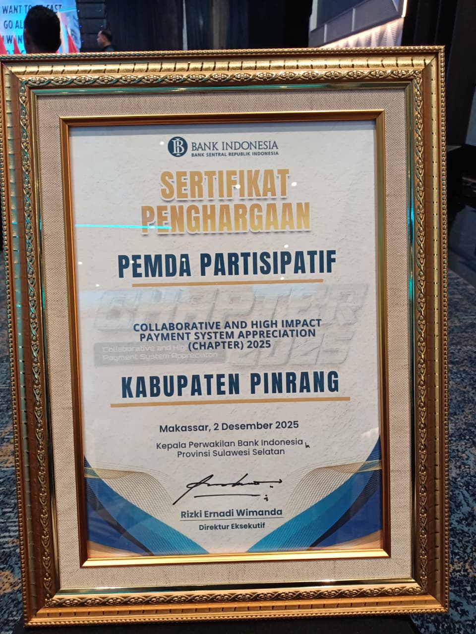 Tiga kategori yang berhasil disabet Pinrang yakni: Juara 2 Implementasi Kartu Kredit Pemerintah Daerah (KKPD), Juara 2 Pemanfaatan E-Commerce dalam Belanja Daerah, dan Penghargaan atas Partisipasi Aktif dalam Digitalisasi Pembayaran Daerah.