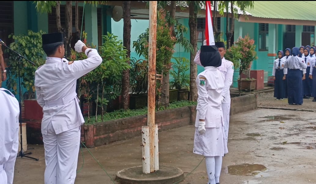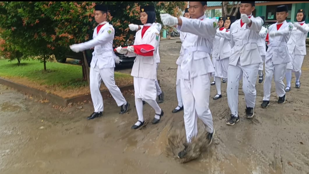 Meski harus melewati jalan berlumpur hingga percikan lumpur membasahi seragam mereka, para siswa tetap melaksanakan tugas pengibaran bendera dengan penuh disiplin dan tanggung jawab.
